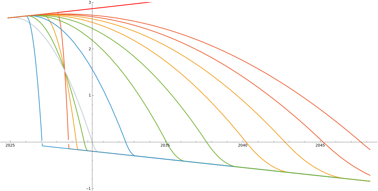 If departing from our historical trajectory at a later date than 2026 Jan 1, simply take the amount of time since 2026 Jan 1, divide by two, and then subtract the result from the dates listed above. (So, for example, if departing at 2026 Febr 2, that is 32 days later, each of the dates above would move backward in time by 16 days.) A given peak becomes precluded, when the forward-delaying start-date intercepts the backward-regressing Net Zero date, meaning we would have to instantly go straight to Net Zero to achieve that peak; after that point, it means we have overshot. (So, for example, 430 PPM will become precluded, when we overshoot it, which on our current trajectory will be 2026 Sept 12; next, 435 PPM will be precluded, when we overshoot it, on our current trajectory 2028 July 3.) All above assumes purely parabolic net emissions trajectories, for mathematical simplicity; in reality the results of course will be different, depending on how much our true trajectory diverges from the parabolic; nevertheless, the trajectories and dates above may be taken as characteristic. The temperature calibration assumes preï⁠ndustrial baseline cumulative concentration 275 PPM; and that we crossed 1.5 ° C warming on 2024 Nov 6, when cumulative concentration overshot 425 PPM. Figure 2B, to avoid cluttering, only depicts the peak 435 PPM start-date 2025 Jan 1 trajectory; the point of the figure is to show, not specifics, but simply the general behaviour of the cumulative concentration curve (Net Positive increasing, Net Zero maximum, Net Negative decreasing). In figures 1B, the particular post- Net Zero subtrajectories are purely hypothetical, and do not affect the calculation of the peaks; what matters is that we do in fact reach Net Negative, even if it is a shallower or deeper Net Negative than I have pictured here; but, deeper is better, because it means cumulative concentration will decrease faster. Finally and importantly, please note that I am using a strict definition of Net Zero and the net emissions rate generally here, equal to the actual final measured Keeling Curve first time-derivative. So, any indirect ecological feedbacks – such as the aforementioned Siberian permafrost melt gas release feedback, and the Amazon rainforest dieback effect – are prefactored in, and simply must be overcome, through our reforestation and other environmental restoration-based carbon-capture efforts, in order to reach true Net Zero and true Net Negative under this definition. |