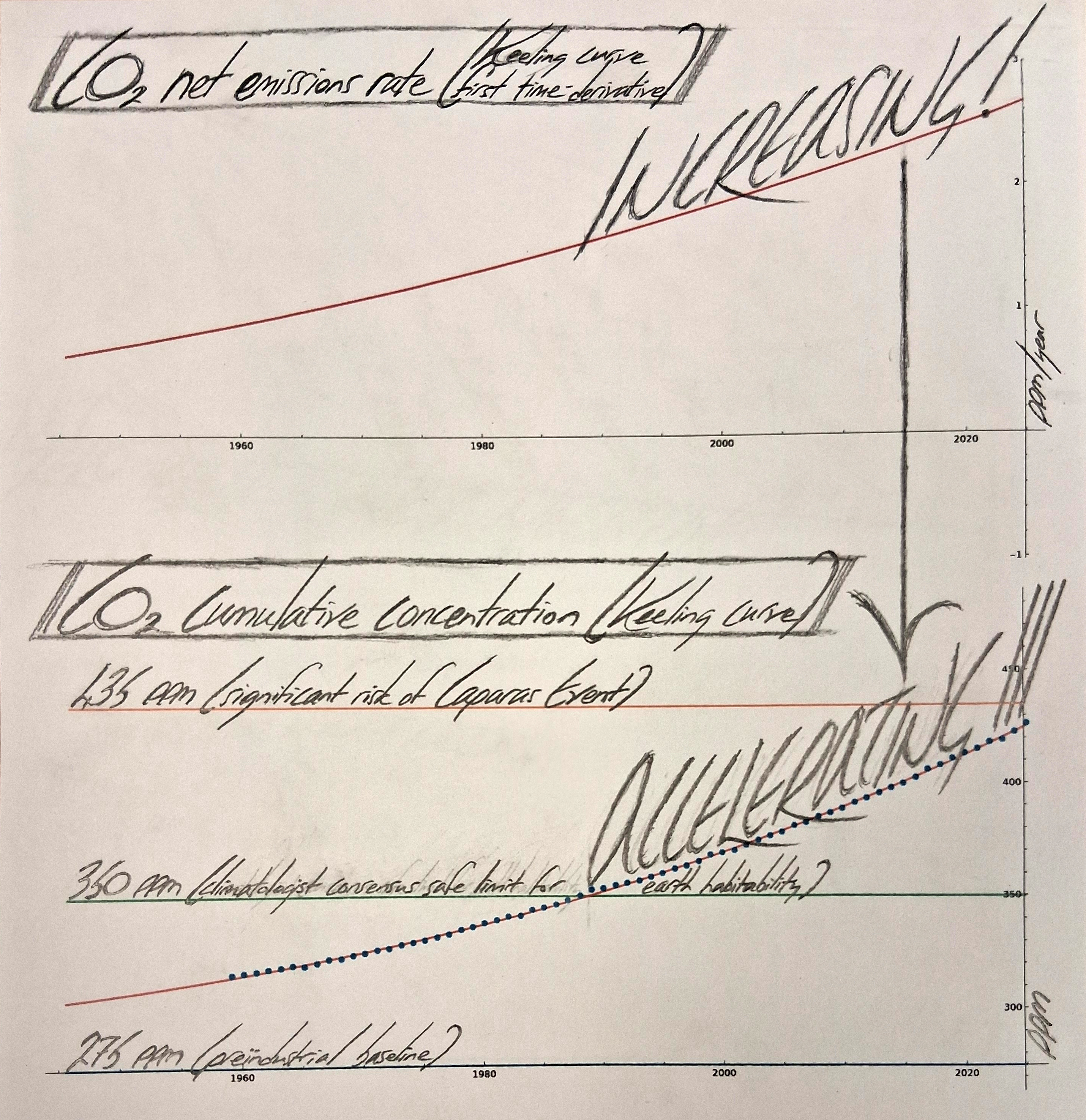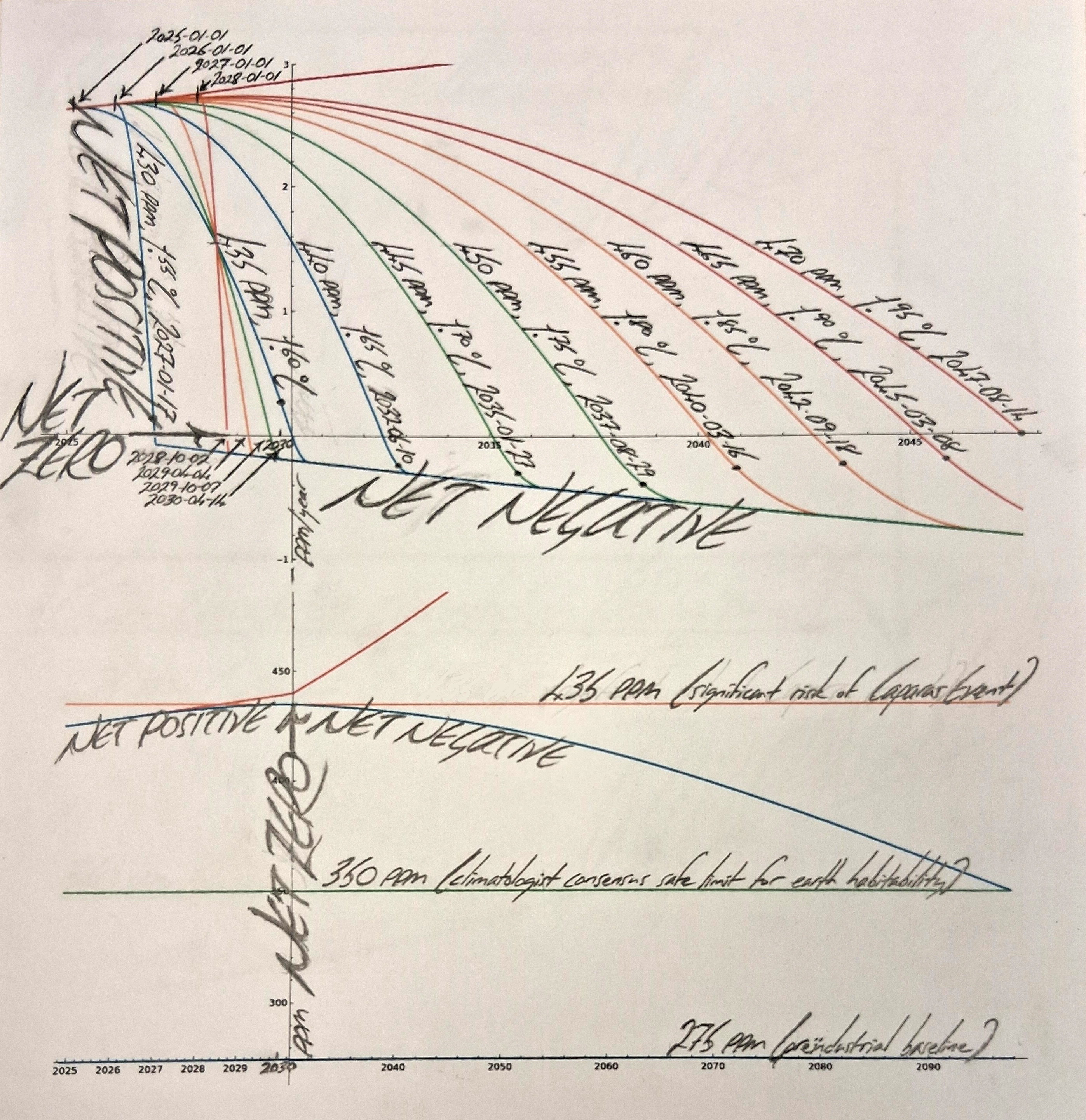 ![]() Figures 1A (top), 2A (bottom). Our historical and current trajectory. (Keeling, Keeling, 1958–⁠present.) An increasing CO₂ net emissions rate produces an accelerating CO₂ cumulative concentration. This trajectory leads to death, for our species and the biosphere, with 100 % certainty, according to the laws of physics. ![]() Figures 1B-i (top), 2B (bottom). Our possible future trajectories. A decreasing but still Net Positive emissions rate will produce a decelerating but still increasing cumulative concentration. It is only once we pass Net Zero, and reach NET NEGATIVE EMISSIONS, that cumulative concentration will begin decreasing, back down toward the climatologist consensus safe range for earth habitability, of below 350 PPM (CO₂.Earth, 2015–⁠present). As of 2026 Febr 2, we were at about 428.4 PPM, and rising by about 2.8 PPM/year. At or below 435 PPM, we have a decreased risk of a Caparas Event occurring; at or above 440 PPM, we have an increased risk (relative to the risk found, by the authors of Caparas et al, 2021, for such an event to occur by 2030, on our current trajectory); and the higher we permit the cumulative concentration to get, the higher the risk will be. Note critically: Our peak cumulative concentration depends linearly on our Net Zero date; every 2 year + 6 month + 26 day climate action delay in the Net Zero date will increase our eventual peak cumulative concentration by 5 PPM. Note furthermore: As you may see, from the four alternative peak 435 PPM trajectories in figure 1B-i above, and from the animated figure 1B-ii below, every 1 year delay in the start-date of major climate action moves the necessary Net Zero date backward by 6 months, to produce the same peak; in other words, every 2 days climate action delay in the start-date actually decreases our total time to reach Net Zero by 3 days, to produce the same peak. NECESSARY NET ZERO DATES—